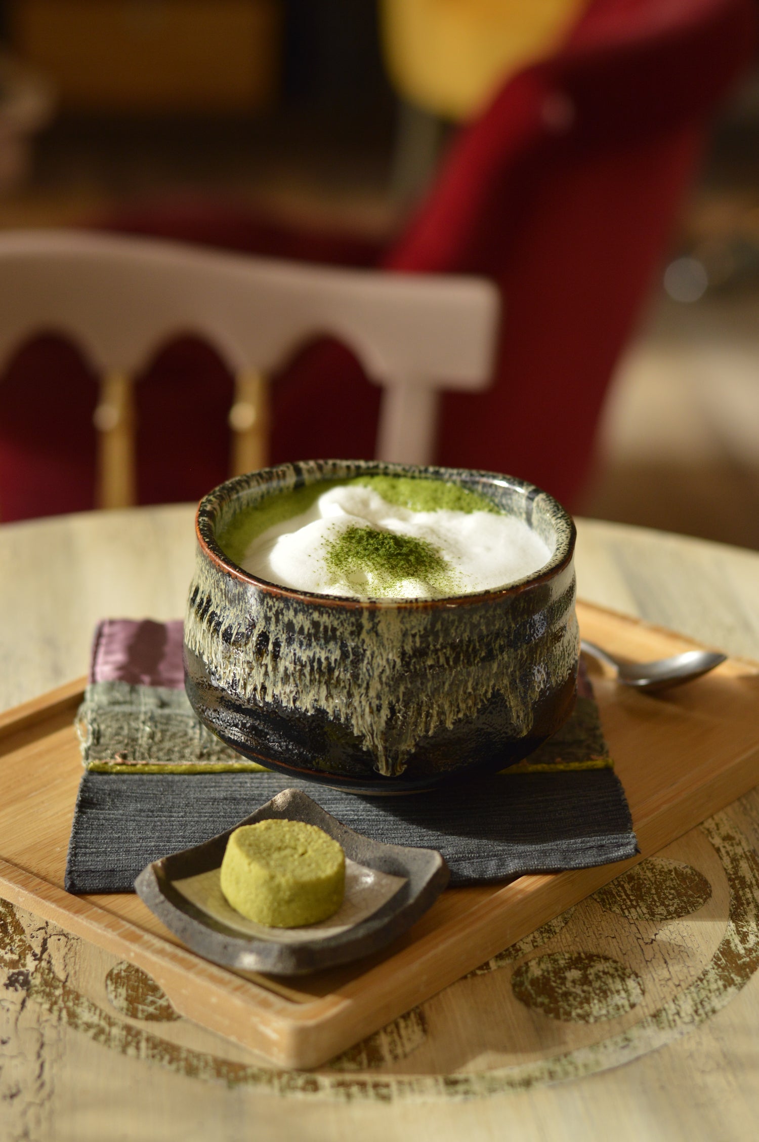 Matcha Cappuccino preparato in Tazza Chawan con latte o latte di soia.